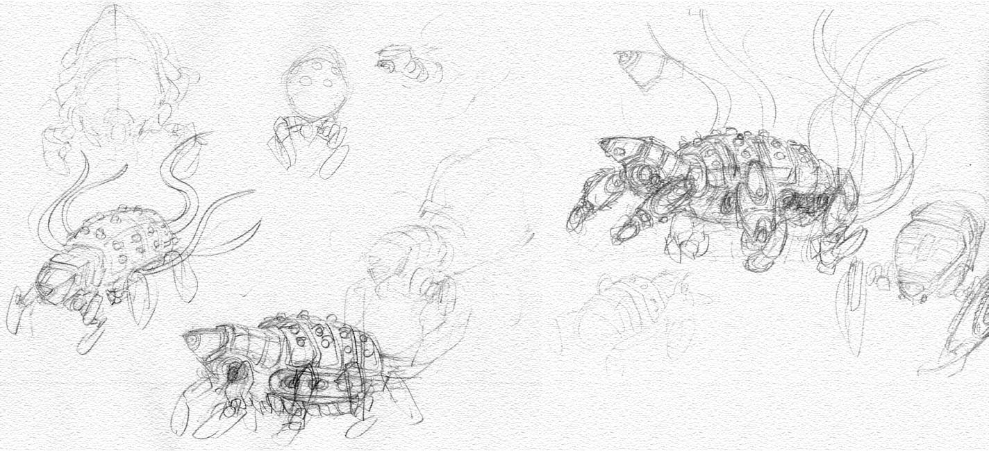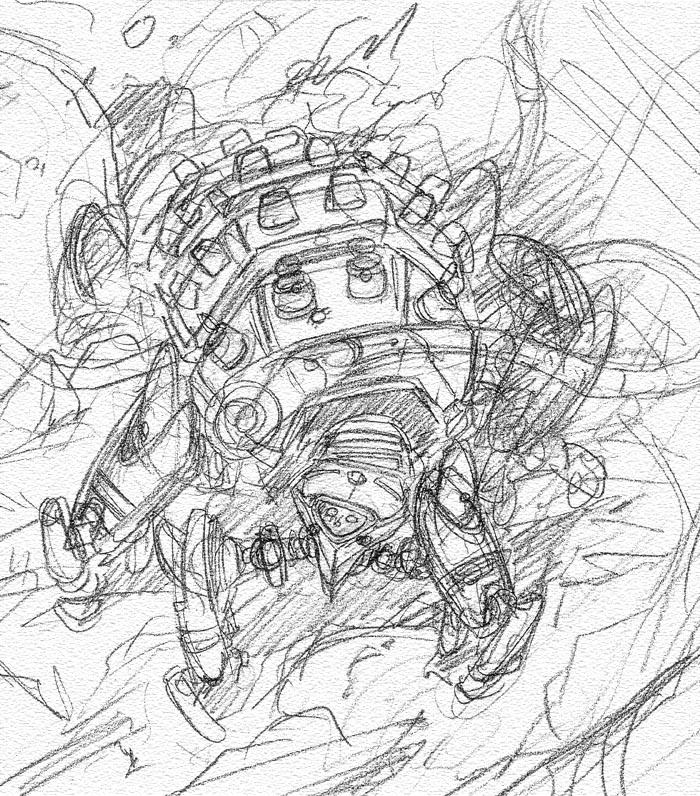 こちらは本編に使用したものの下書き。背中の突起は小型自爆ロボットの発進孔になってるのですが、本編でもちょっと分かりにくかったかな…
