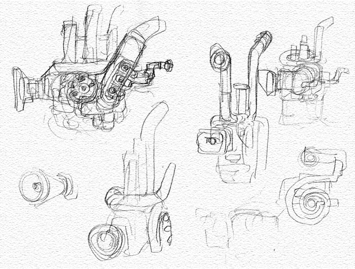 ゼロンの自作機械楽器のラフデザイン。ホルンなどの金管楽器とエンジンのマフラーを併せたような方向で考えていました。